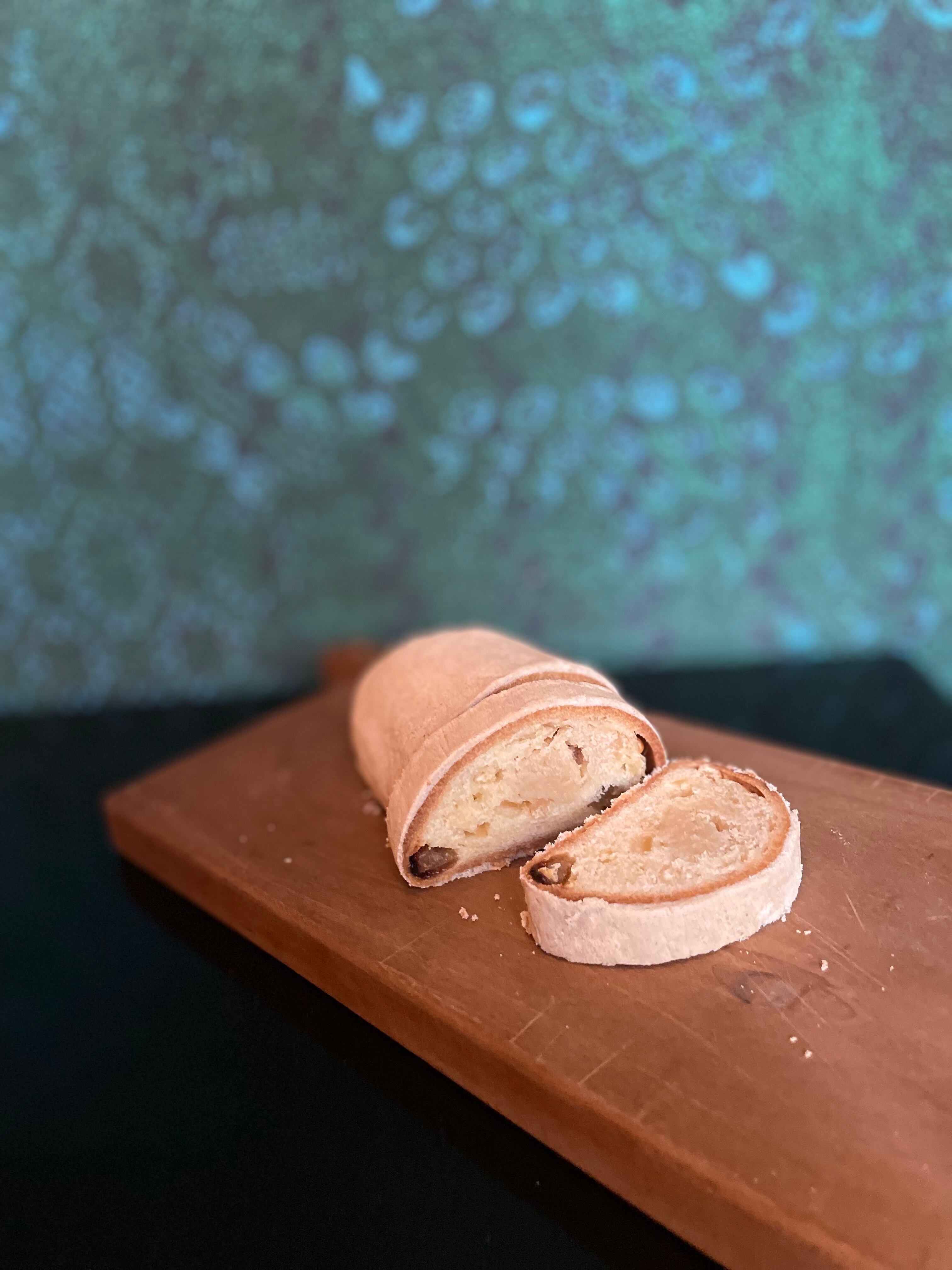 テイクアウト2025.ハルサンタのシュトレン 幻の備前白小豆を餡にして入れたけれど和じゃない仕上がりです。